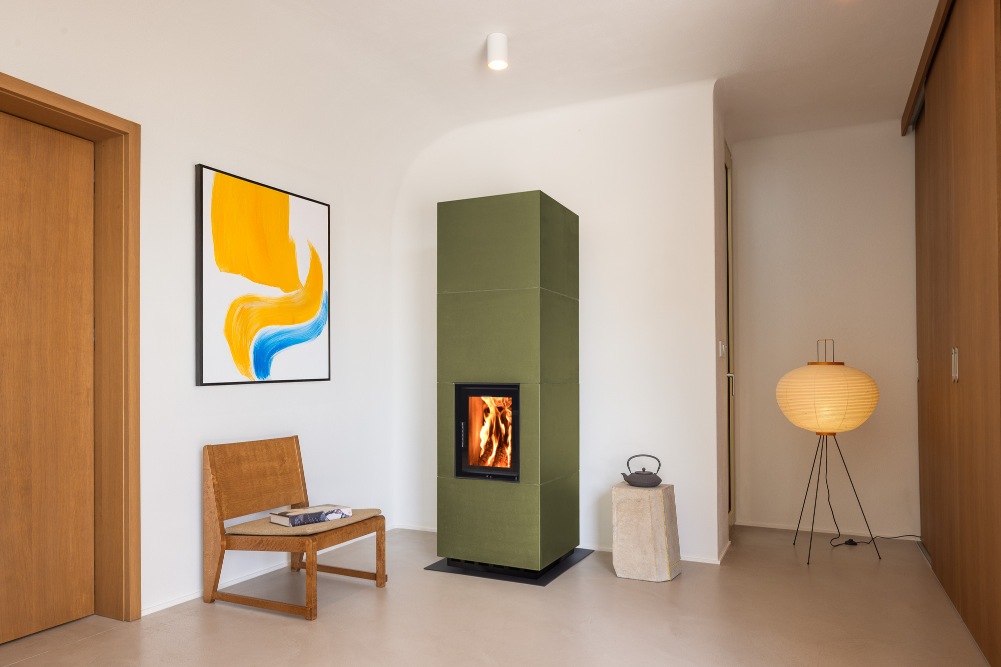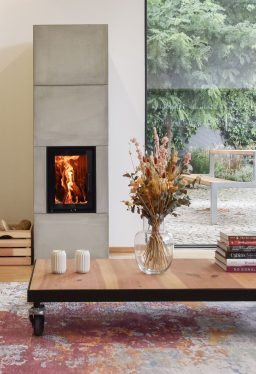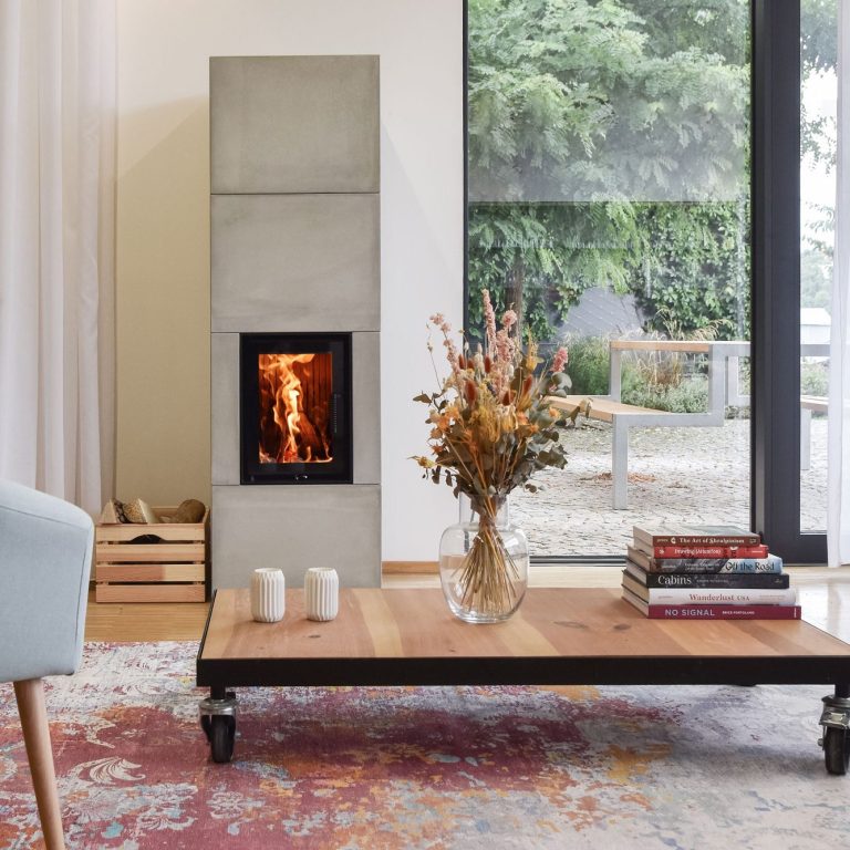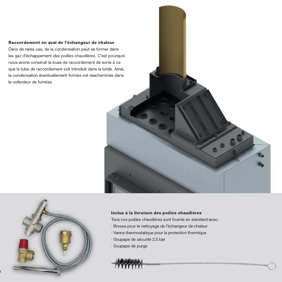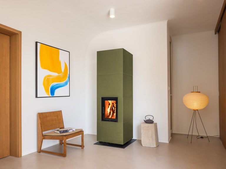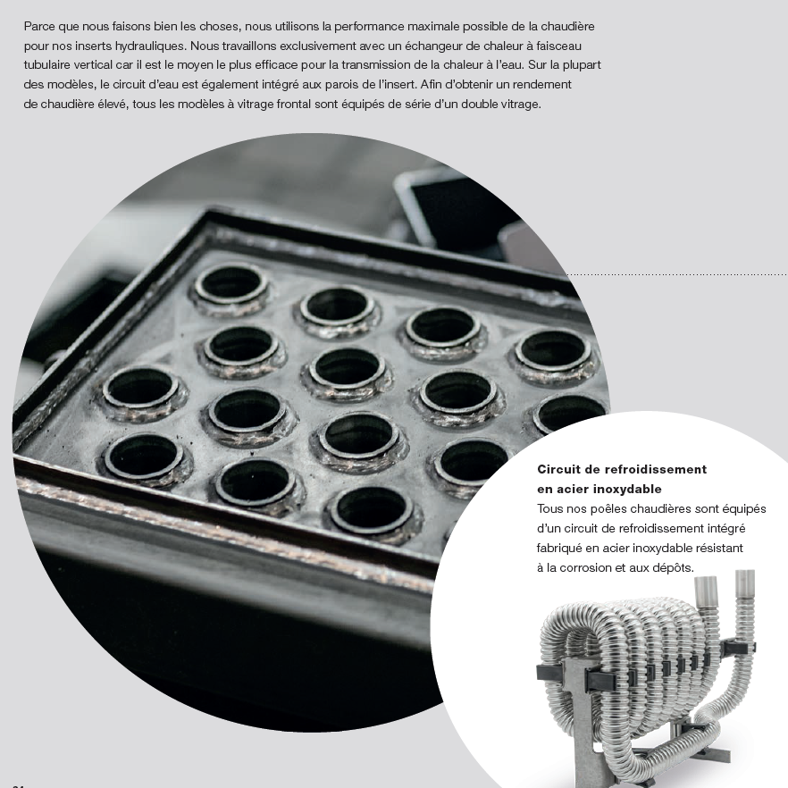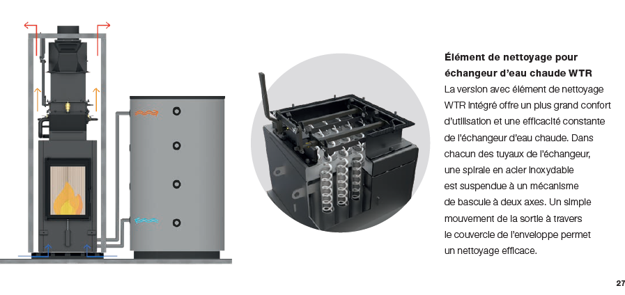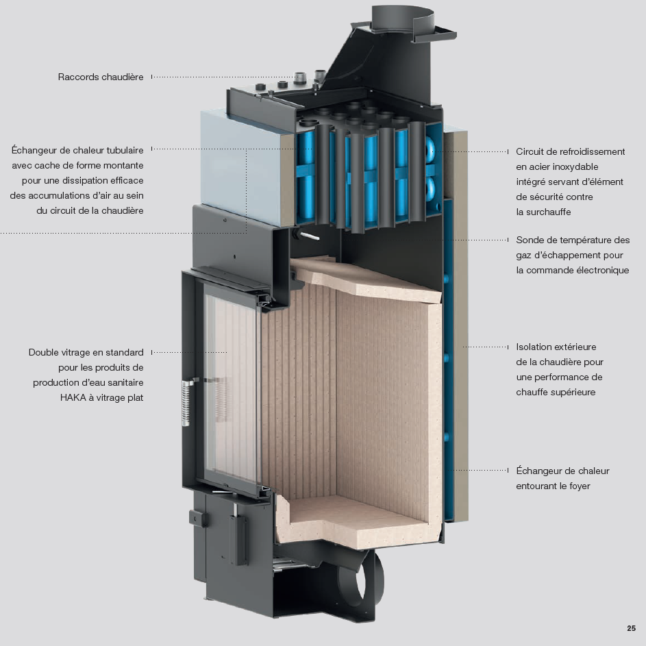 Les gaz chauds de combustion chauffent l’eau grâce à un échangeur intégré. L’eau chaude (70–80 °C) est stockée dans un réservoir tampon, puis utilisée pour les radiateurs, le plancher chauffant et l’eau chaude sanitaire. Le feu fournit l’énergie pour toute la maison, de façon autonome.