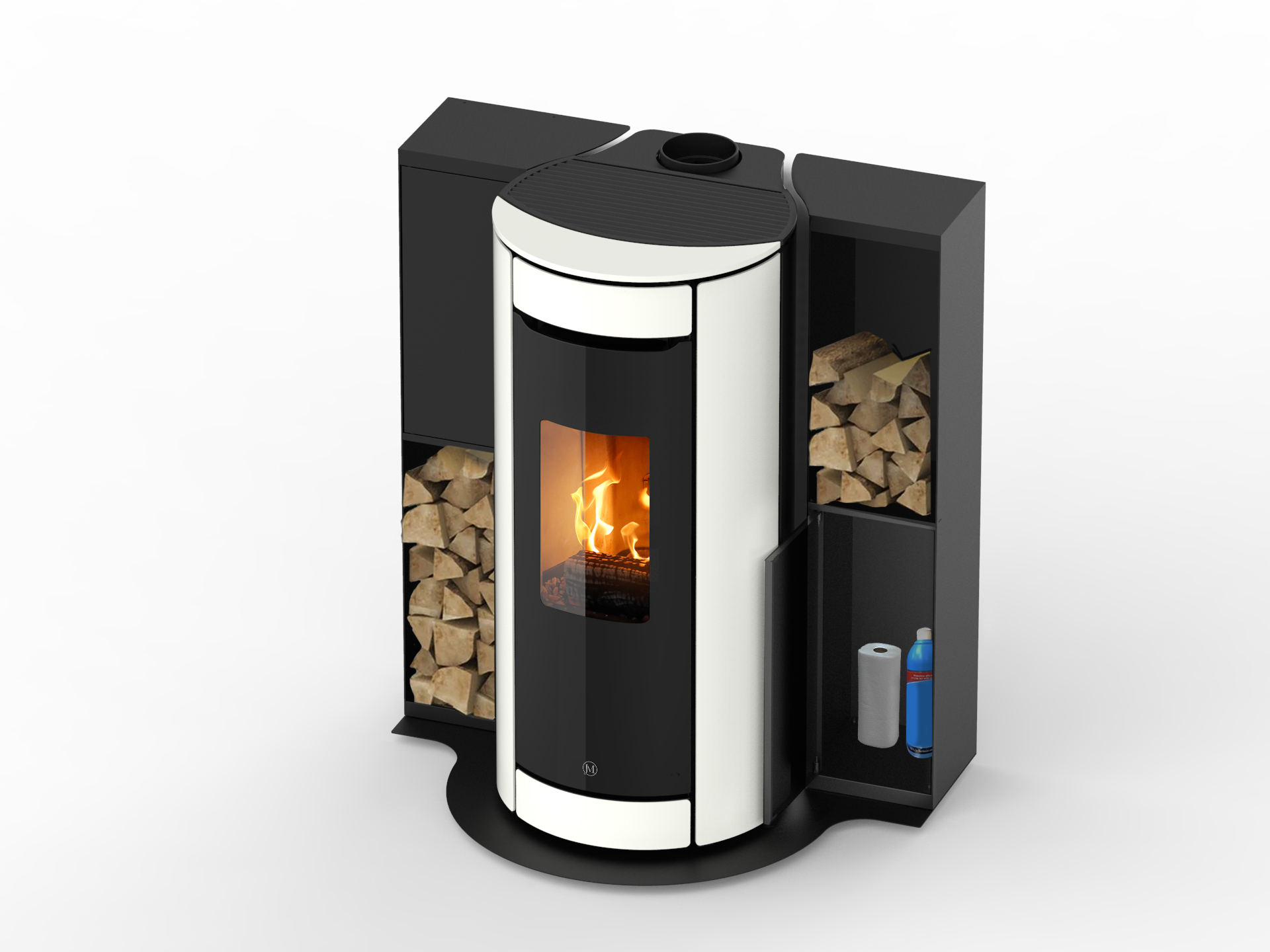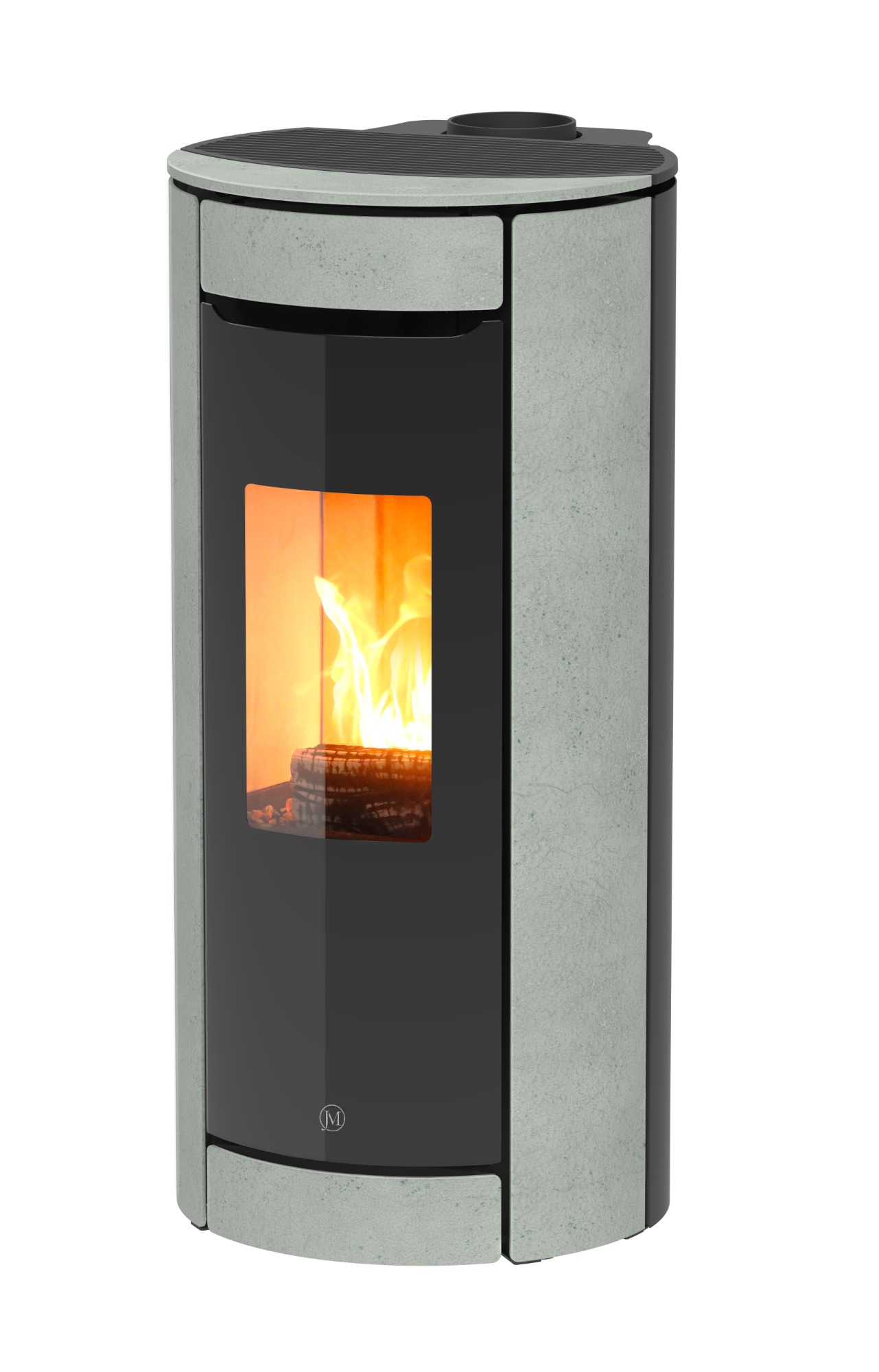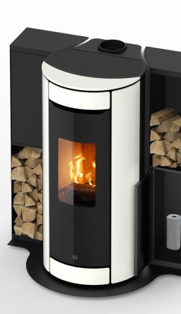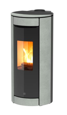 Poêle mixte de nouvelle génération, canalisable, puissance de 6,8 à 8,2 kW. Design moderne et compact. Disponible en finitions verre blanc, verre noir, pierre ollaire ou verre Stardust de la gamme Elegance.