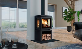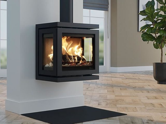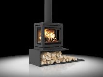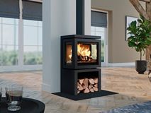 Poêle en acier anthracite à trois faces vitrées (côtés ouvrants pour un nettoyage facile). Vitres pyrolyse pour une combustion plus performante et des vitres plus propres.